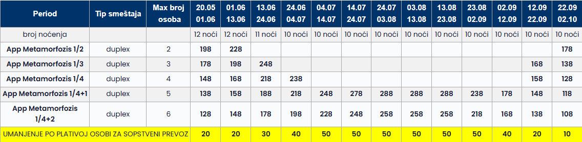 • Datum iz tabele se odnosi na period boravka. Polazak autobusa je dan ranije u odnosu na datum iz tabele.
