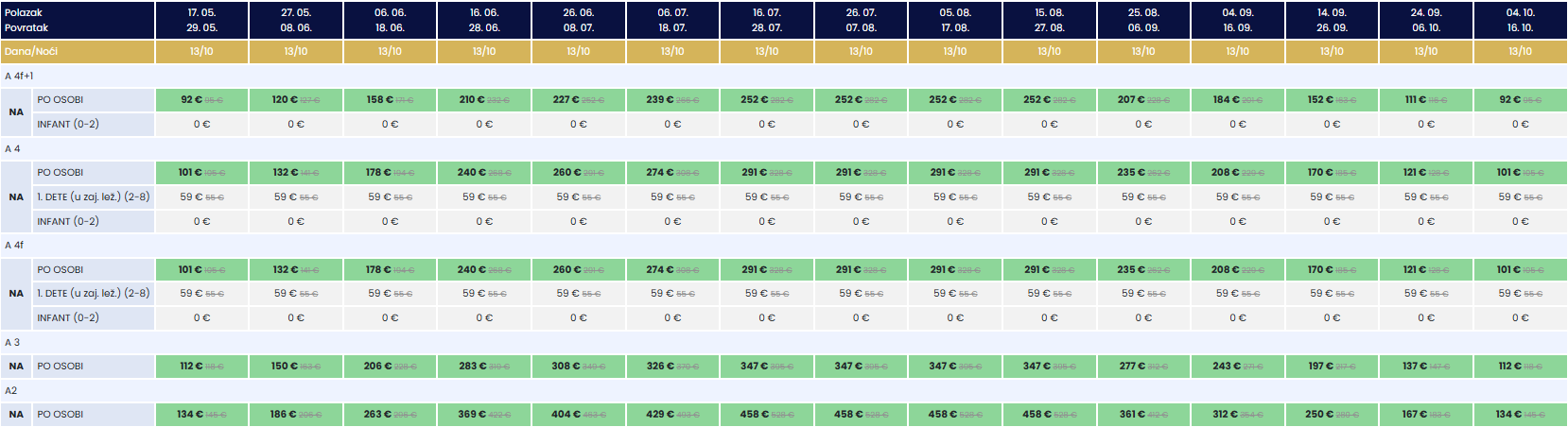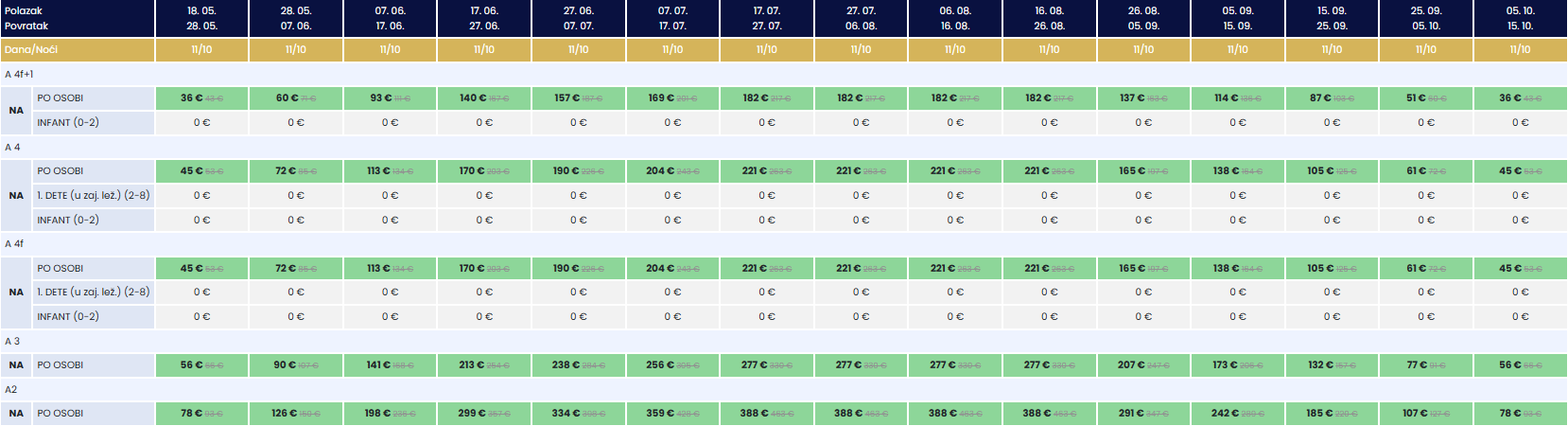 Prilikom obračunavanja popusta cena (u eurima) po osobi zaokružuje se na prvi veći ceo broj (kompjuterski generisano). Popusti ne važe za doplate.