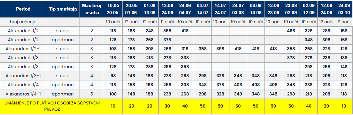 • Datum iz tabele se odnosi na period boravka. Polazak autobusa je dan ranije u odnosu na datum iz tabele.