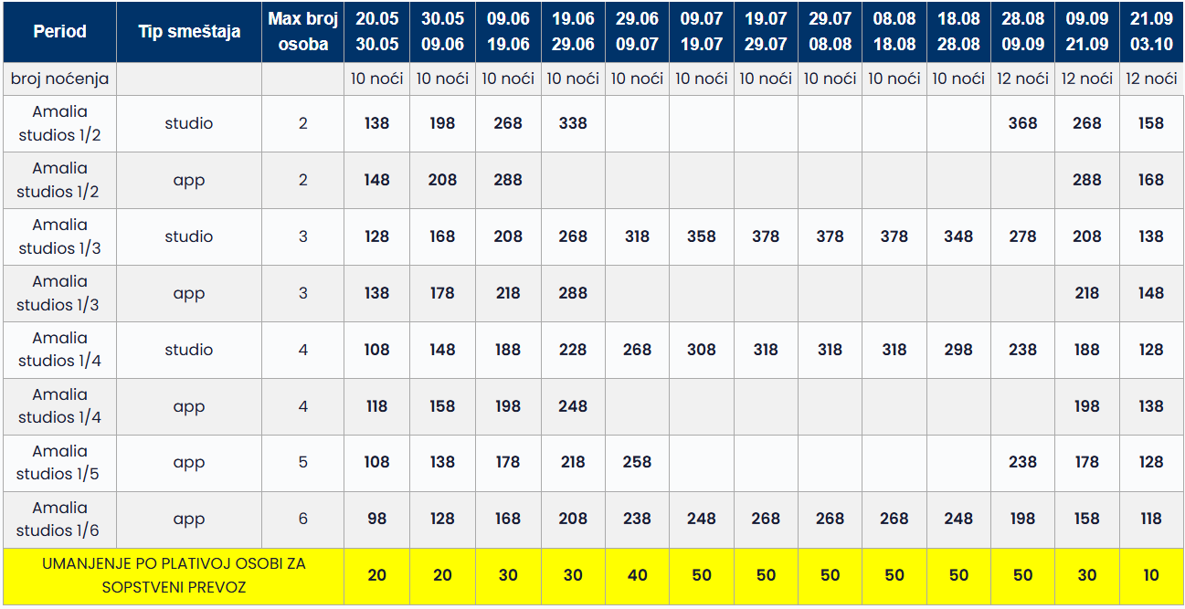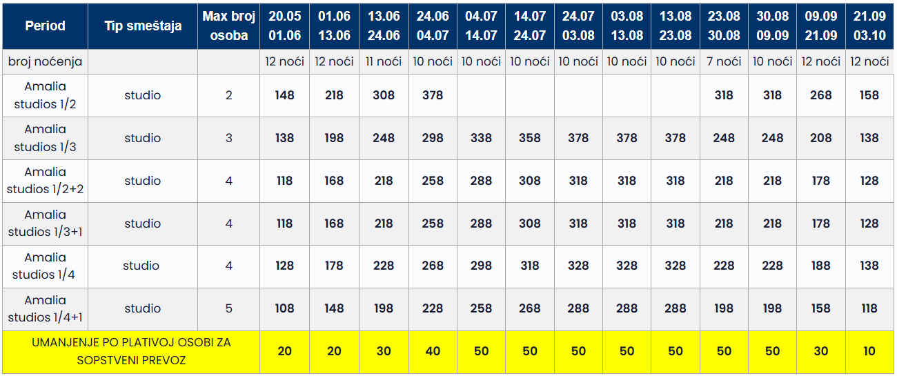 • Datum iz tabele se odnosi na period boravka. Polazak autobusa je dan ranije u odnosu na datum iz tabele.