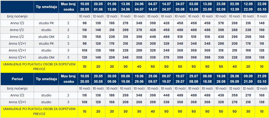 Cene iz tabele predstavljaju cenu paket aranžmana (smeštaj + prevoz) po osobi.