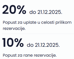 1. Popust za ranu rezervaciju u visini do 10%. Za ovaj popust dovoljna je samo rana rezervacija, odnosno nije neophodna uplata u celosti.