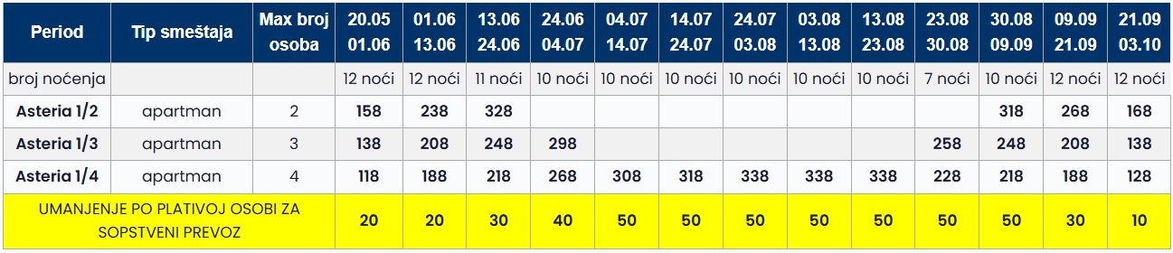 Cene iz tabele predstavljaju cenu paket aranžmana (smeštaj + prevoz) po osobi.