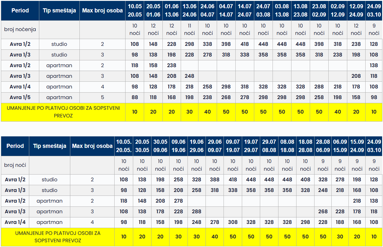 • Datum iz tabele se odnosi na period boravka. Polazak autobusa je dan ranije u odnosu na datum iz tabele.