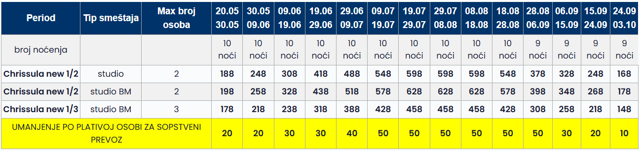 • Datum iz tabele se odnosi na period boravka. Polazak autobusa je dan ranije u odnosu na datum iz tabele.