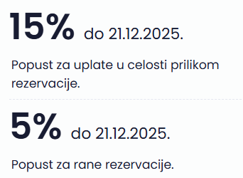 1. Popust za ranu rezervaciju u visini do 10%. Za ovaj popust dovoljna je samo rana rezervacija, odnosno nije neophodna uplata u celosti.