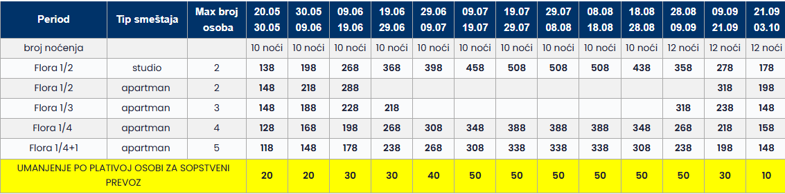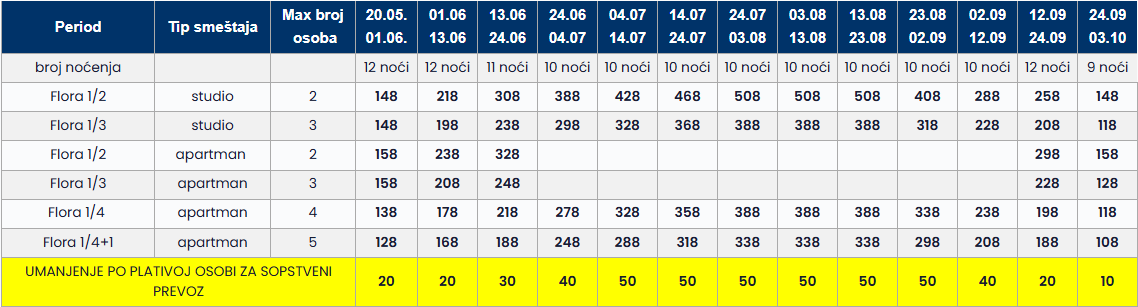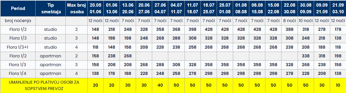 • Datum iz tabele se odnosi na period boravka. Polazak autobusa je dan ranije u odnosu na datum iz tabele.