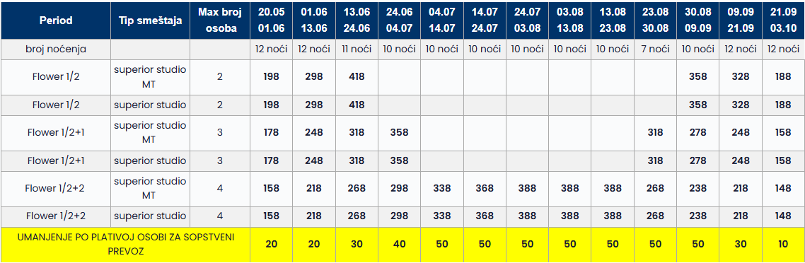 Cene iz tabele predstavljaju cenu paket aranžmana (smeštaj + prevoz) po osobi.