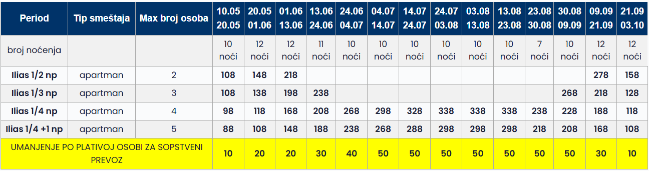 Cene iz tabele predstavljaju cenu paket aranžmana (smeštaj + prevoz) po osobi.