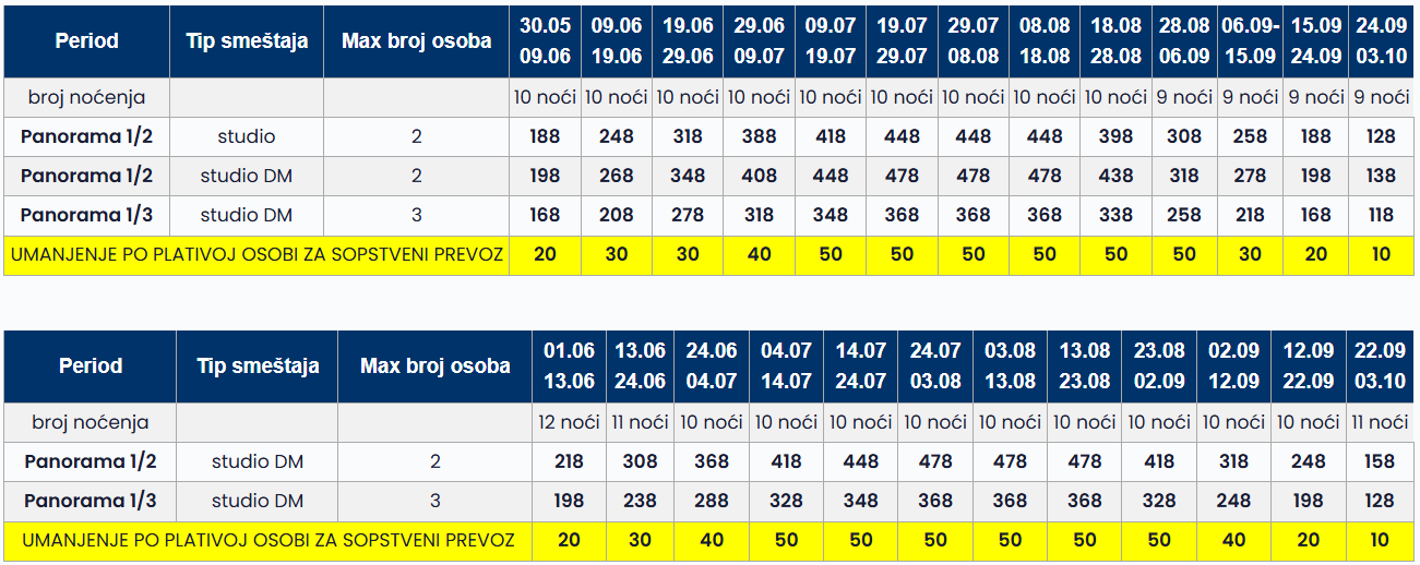 • Datum iz tabele se odnosi na period boravka. Polazak autobusa je dan ranije u odnosu na datum iz tabele.
