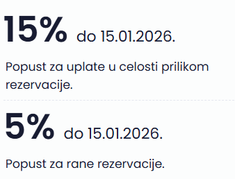 1. Popust za ranu rezervaciju u visini do 10%. Za ovaj popust dovoljna je samo rana rezervacija, odnosno nije neophodna uplata u celosti.