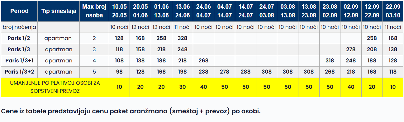 • Datum iz tabele se odnosi na period boravka. Polazak autobusa je dan ranije u odnosu na datum iz tabele.