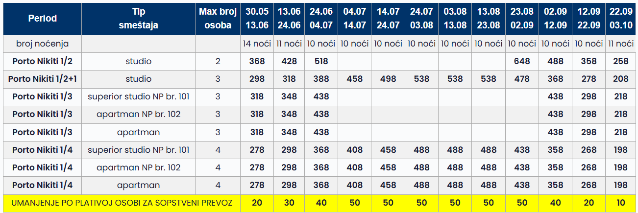 Cene iz tabele predstavljaju cenu paket aranžmana (smeštaj + prevoz) po osobi.