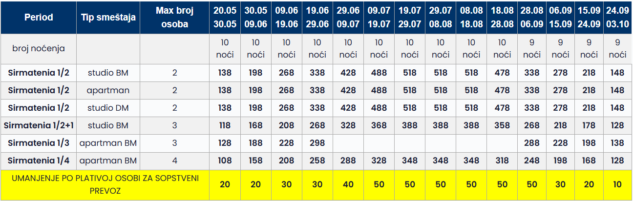 • Datum iz tabele se odnosi na period boravka. Polazak autobusa je dan ranije u odnosu na datum iz tabele.