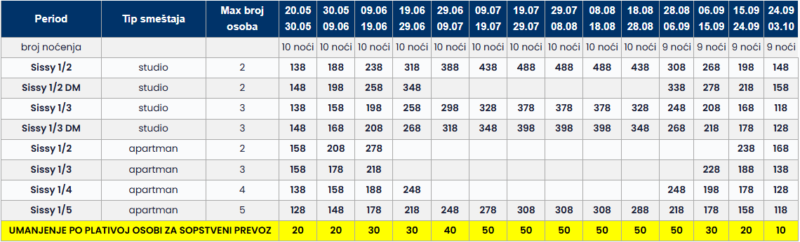 • Datum iz tabele se odnosi na period boravka. Polazak autobusa je dan ranije u odnosu na datum iz tabele.