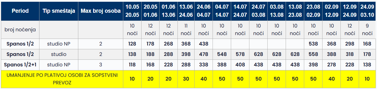 Cene iz tabele predstavljaju cenu paket aranžmana (smeštaj + prevoz) po osobi.
