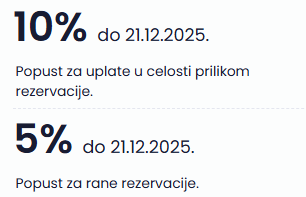 1. Popust za ranu rezervaciju u visini do 10%. Za ovaj popust dovoljna je samo rana rezervacija, odnosno nije neophodna uplata u celosti.