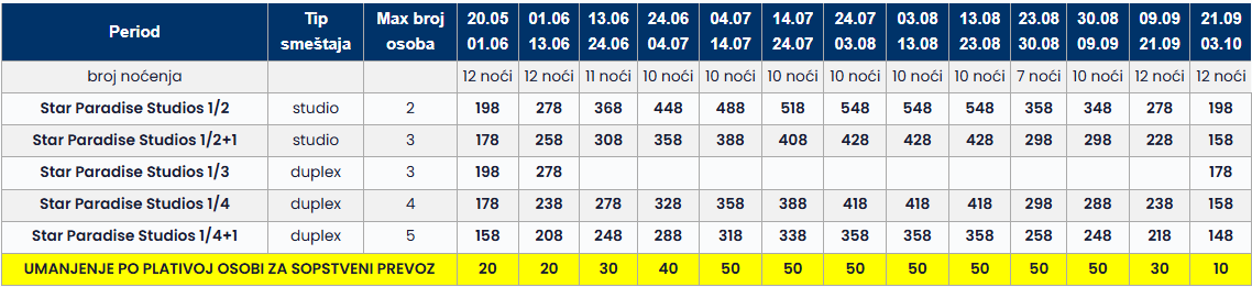 • Datum iz tabele se odnosi na period boravka. Polazak autobusa je dan ranije u odnosu na datum iz tabele.