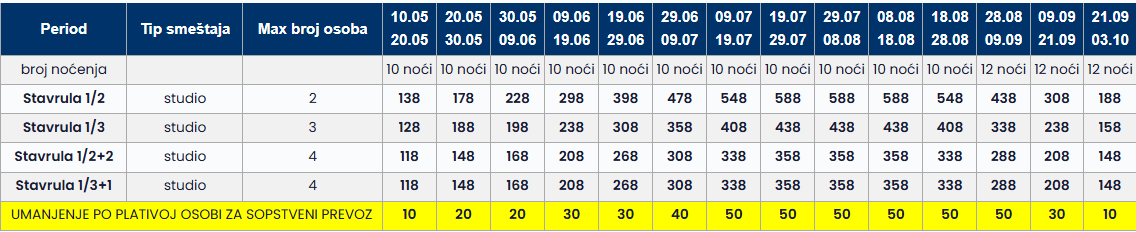 • Datum iz tabele se odnosi na period boravka. Polazak autobusa je dan ranije u odnosu na datum iz tabele.