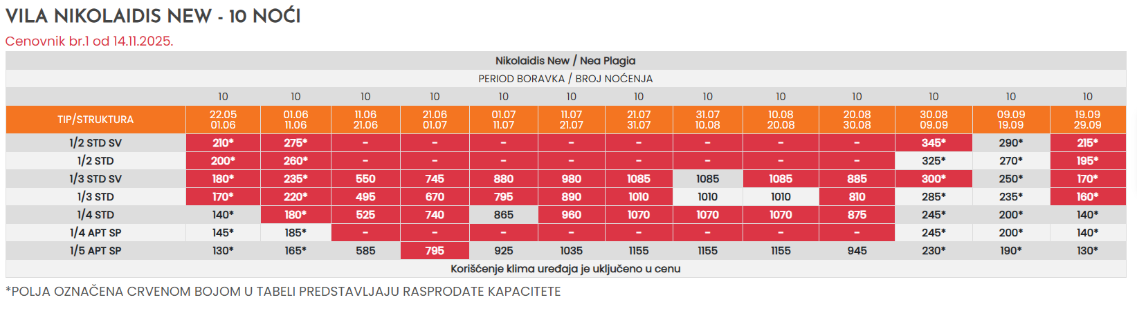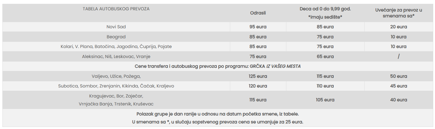 * - Sve cene koje su označene znakom “*” (zvezdica) podrazumevaju predsezonske i postsezonske cene, a koje obuhvataju prevoz autobusom sa polaskom iz Niša i smeštaj u odabranom objektu po osobi sa polaskom iz Niša. Ukoliko je polazak severnije od Niša, cena se uvećava za iznos teritorijalne doplate u tabeli autobuskog prevoza.