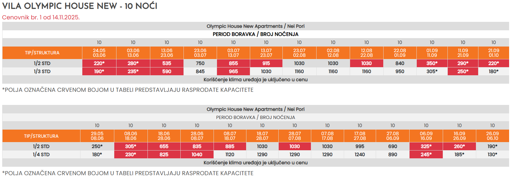 * - Sve cene koje su označene znakom “*” (zvezdica) podrazumevaju predsezonske i postsezonske cene, a koje obuhvataju prevoz autobusom sa polaskom iz Niša i smeštaj u odabranom objektu po osobi sa polaskom iz Niša. Ukoliko je polazak severnije od Niša, cena se uvećava za iznos teritorijalne doplate u tabeli autobuskog prevoza.