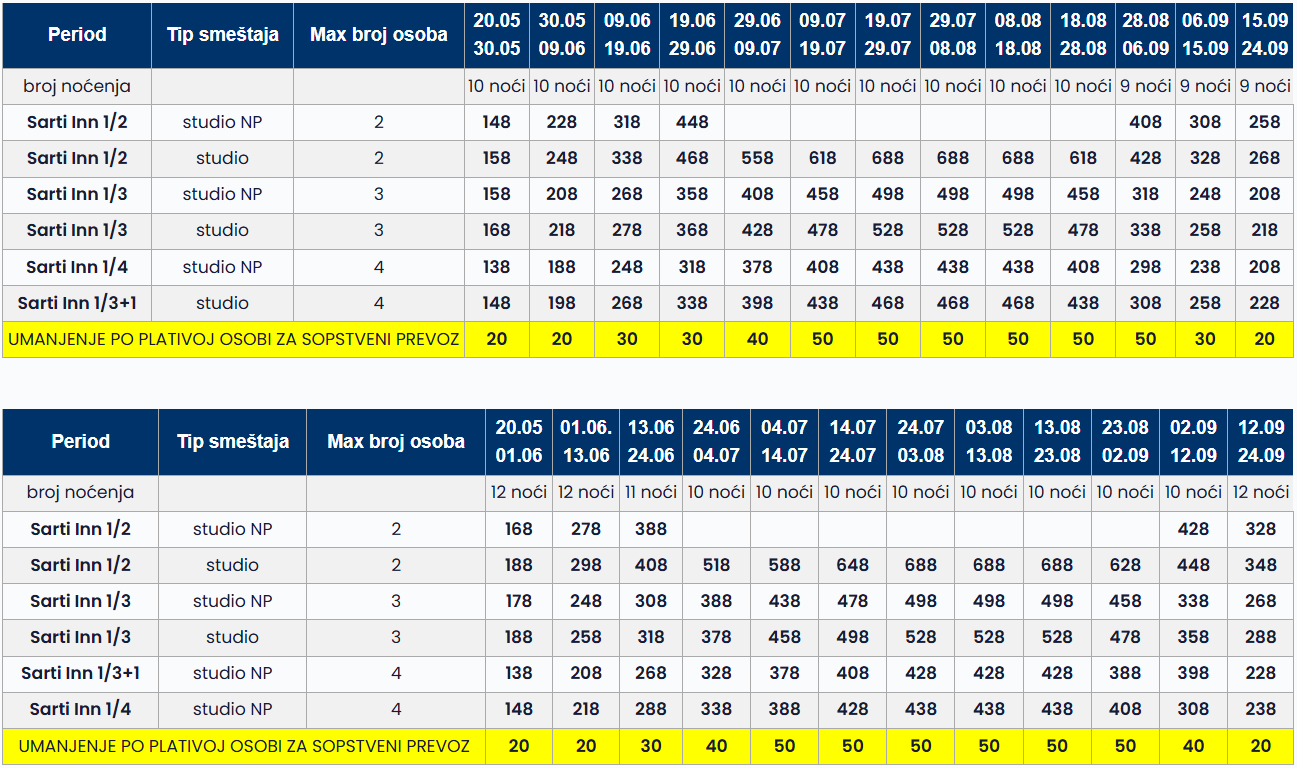 • Datum iz tabele se odnosi na period boravka. Polazak autobusa je dan ranije u odnosu na datum iz tabele.