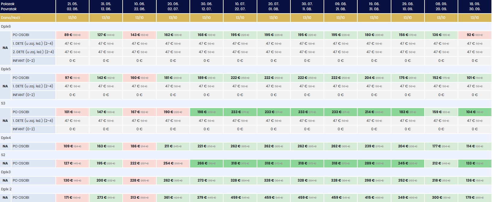 Prilikom obračunavanja popusta cena (u eurima) po osobi zaokružuje se na prvi veći ceo broj (kompjuterski generisano). Popusti ne važe za doplate.