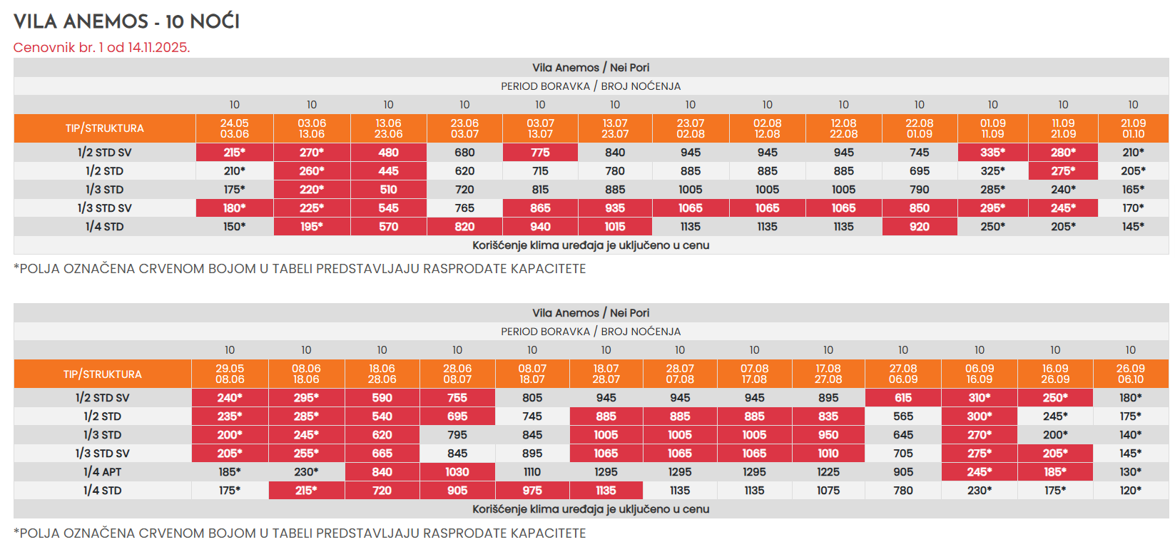 Sve cene u tabelama date su u eurima, a plative su isključivo u dinarskoj protivvrednosti po srednjem kursu Narodne banke Srbije na dan uplate. Cena aranžmana garantovana je samo za uplaćeni deo ukupne sume, ostatak je podložan promeni u slučaju oscilacije kursa ili inflacije.