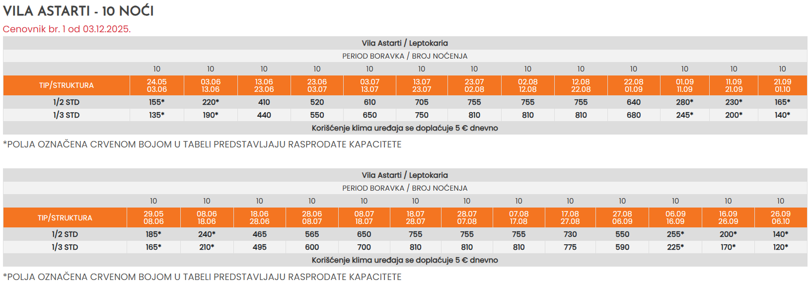 * - Sve cene koje su označene znakom “*” (zvezdica) podrazumevaju predsezonske i postsezonske cene, a koje obuhvataju prevoz autobusom sa polaskom iz Niša i smeštaj u odabranom objektu po osobi sa polaskom iz Niša. Ukoliko je polazak severnije od Niša, cena se uvećava za iznos teritorijalne doplate u tabeli autobuskog prevoza.