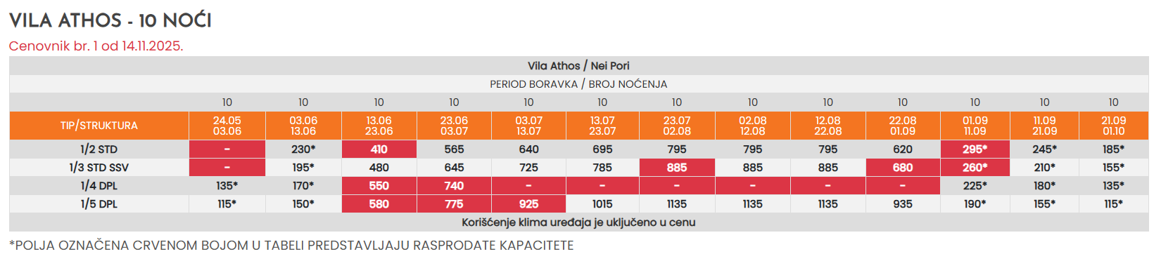 * - Sve cene koje su označene znakom “*” (zvezdica) podrazumevaju predsezonske i postsezonske cene, a koje obuhvataju prevoz autobusom sa polaskom iz Niša i smeštaj u odabranom objektu po osobi sa polaskom iz Niša. Ukoliko je polazak severnije od Niša, cena se uvećava za iznos teritorijalne doplate u tabeli autobuskog prevoza.