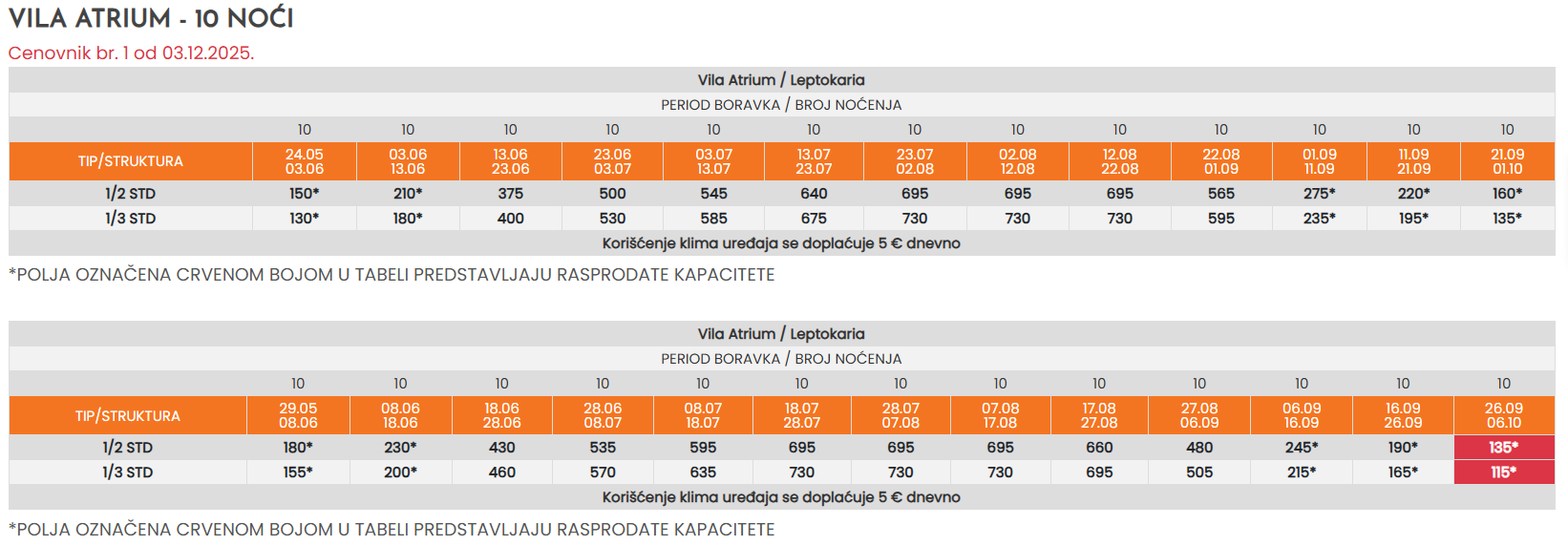 Sve cene u tabelama date su u eurima, a plative su isključivo u dinarskoj protivvrednosti po srednjem kursu Narodne banke Srbije na dan uplate. Cena aranžmana garantovana je samo za uplaćeni deo ukupne sume, ostatak je podložan promeni u slučaju oscilacije kursa ili inflacije.