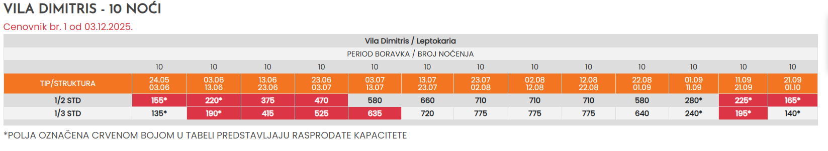 * - Sve cene koje su označene znakom “*” (zvezdica) podrazumevaju predsezonske i postsezonske cene, a koje obuhvataju prevoz autobusom sa polaskom iz Niša i smeštaj u odabranom objektu po osobi sa polaskom iz Niša. Ukoliko je polazak severnije od Niša, cena se uvećava za iznos teritorijalne doplate u tabeli autobuskog prevoza.