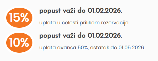 - Jedno dete, do 7 godina u krevetu sa roditeljima (dve punoplatežne osobe) – besplatno. - Jedno dete do 7 godina sa jednim roditeljem (jedna osoba) plaća punu cenu aranžmana.