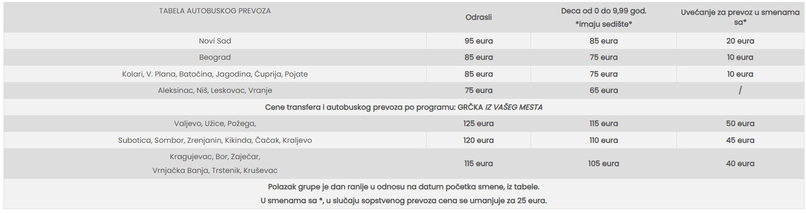 Program GRČKA IZ VAŠEG MESTA obuhvata transfer mini busom, kombijem ili putničkim automobilom iz mesta putnika (mesta iz tabele autobuskog prevoza) do lokacije gde grupu preuzima autobus i dalji transfer do odabrane destinacije uz jedno ili dva presedanja. Transferi do i od Novog Sada/Beograda/Niša/mesta iz tabele autobuskog prevoza mogu biti realizovani mini-busom, kombijem ili putničkim automobilom. Za organizaciju transfera do i od Novog Sada/Beograda/Niša/mesta iz tabele autobuskog prevoza ili do lokacije gde grupu preuzima autobus, minimalan broj putnika za realizaciju transfera je 5 putnika.