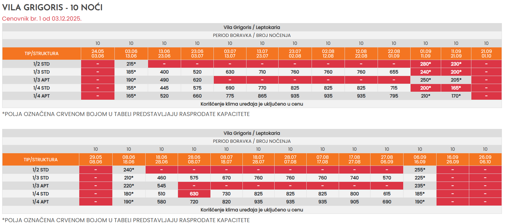 * - Sve cene koje su označene znakom “*” (zvezdica) podrazumevaju predsezonske i postsezonske cene, a koje obuhvataju prevoz autobusom sa polaskom iz Niša i smeštaj u odabranom objektu po osobi sa polaskom iz Niša. Ukoliko je polazak severnije od Niša, cena se uvećava za iznos teritorijalne doplate u tabeli autobuskog prevoza.