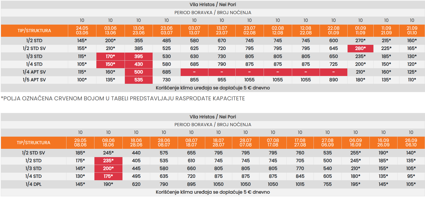 Sve cene u tabelama date su u eurima, a plative su isključivo u dinarskoj protivvrednosti po srednjem kursu Narodne banke Srbije na dan uplate. Cena aranžmana garantovana je samo za uplaćeni deo ukupne sume, ostatak je podložan promeni u slučaju oscilacije kursa ili inflacije.