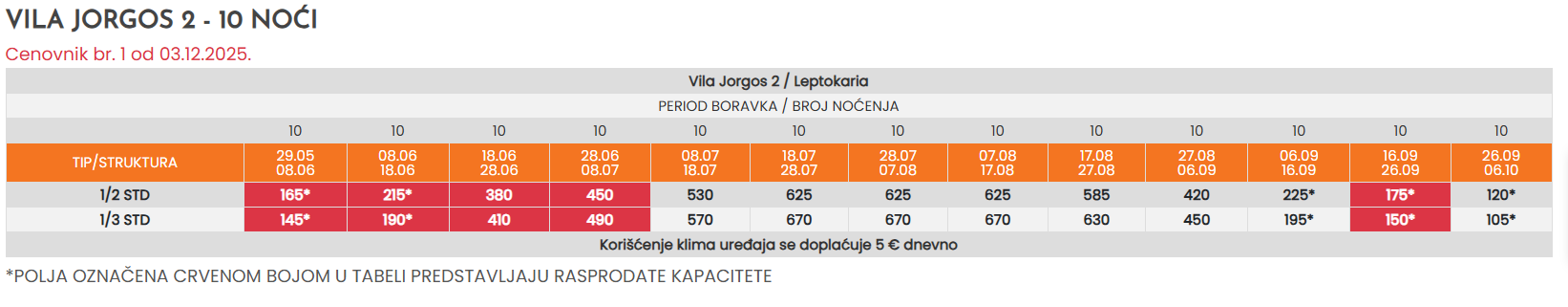 * - Sve cene koje su označene znakom “*” (zvezdica) podrazumevaju predsezonske i postsezonske cene, a koje obuhvataju prevoz autobusom sa polaskom iz Niša i smeštaj u odabranom objektu po osobi sa polaskom iz Niša. Ukoliko je polazak severnije od Niša, cena se uvećava za iznos teritorijalne doplate u tabeli autobuskog prevoza.