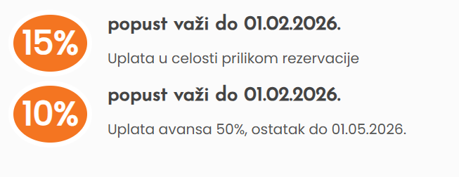 Za gotovinske uplate celokupnog iznosa prilikom rezervacije do 01. februara odobrava se popust od 15%