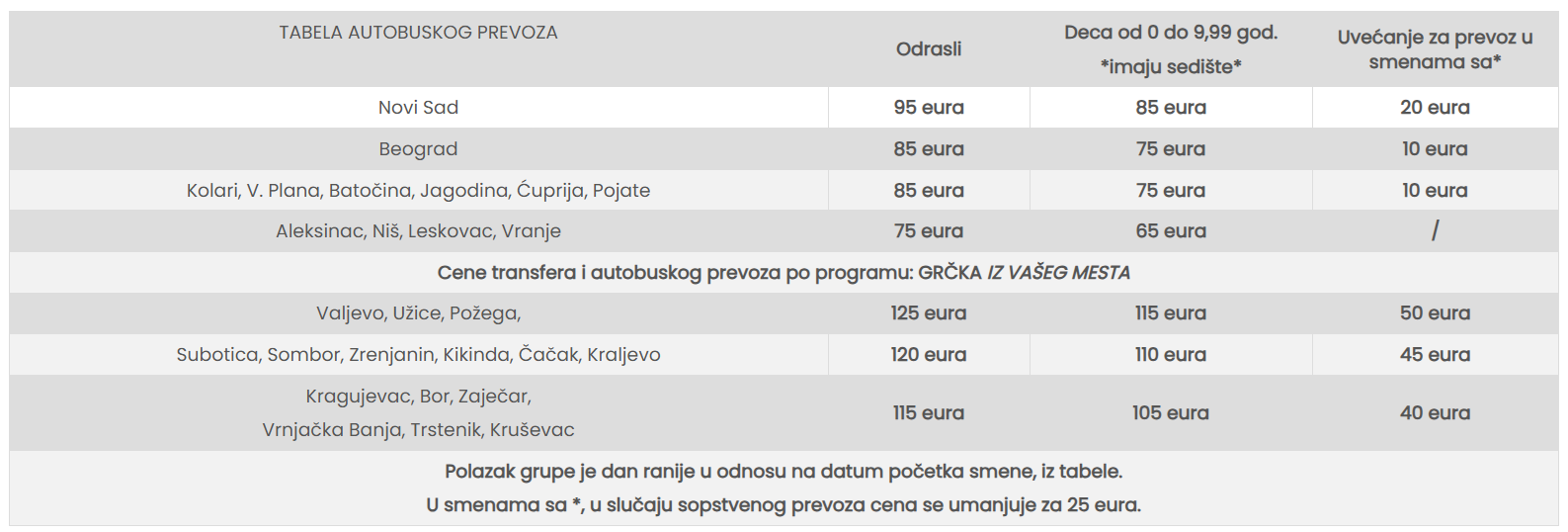 * - Sve cene koje su označene znakom “*” (zvezdica) podrazumevaju predsezonske i postsezonske cene, a koje obuhvataju prevoz autobusom sa polaskom iz Niša i smeštaj u odabranom objektu po osobi sa polaskom iz Niša. Ukoliko je polazak severnije od Niša, cena se uvećava za iznos teritorijalne doplate u tabeli autobuskog prevoza.