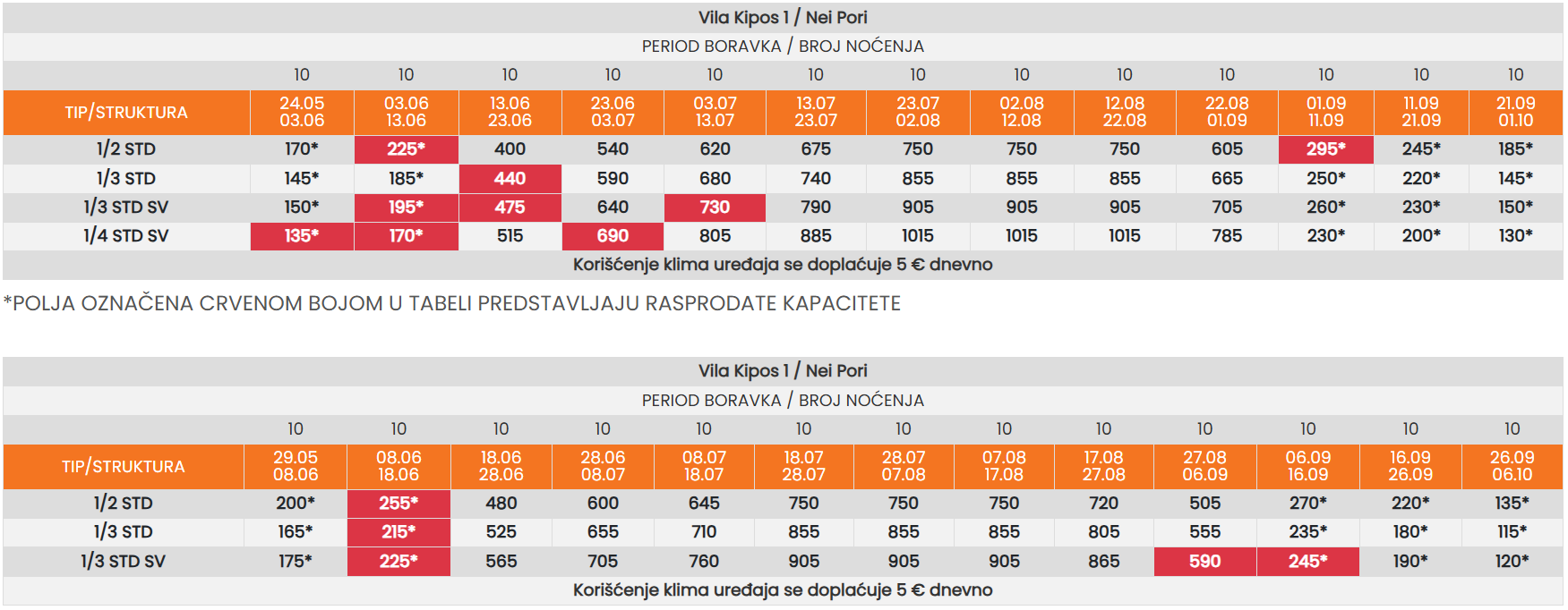 Sve cene u tabelama date su u eurima, a plative su isključivo u dinarskoj protivvrednosti po srednjem kursu Narodne banke Srbije na dan uplate. Cena aranžmana garantovana je samo za uplaćeni deo ukupne sume, ostatak je podložan promeni u slučaju oscilacije kursa ili inflacije.