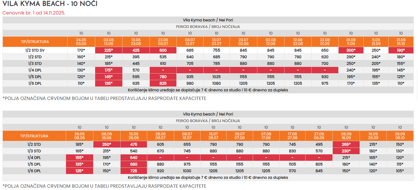Sve cene u tabelama date su u eurima, a plative su isključivo u dinarskoj protivvrednosti po srednjem kursu Narodne banke Srbije na dan uplate. Cena aranžmana garantovana je samo za uplaćeni deo ukupne sume, ostatak je podložan promeni u slučaju oscilacije kursa ili inflacije.
