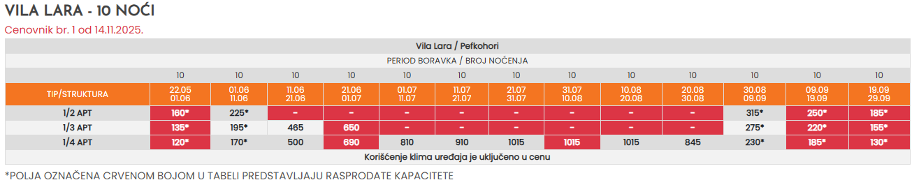 * - Sve cene koje su označene znakom “*” (zvezdica) podrazumevaju predsezonske i postsezonske cene, a koje obuhvataju prevoz autobusom sa polaskom iz Niša i smeštaj u odabranom objektu po osobi sa polaskom iz Niša. Ukoliko je polazak severnije od Niša, cena se uvećava za iznos teritorijalne doplate u tabeli autobuskog prevoza.