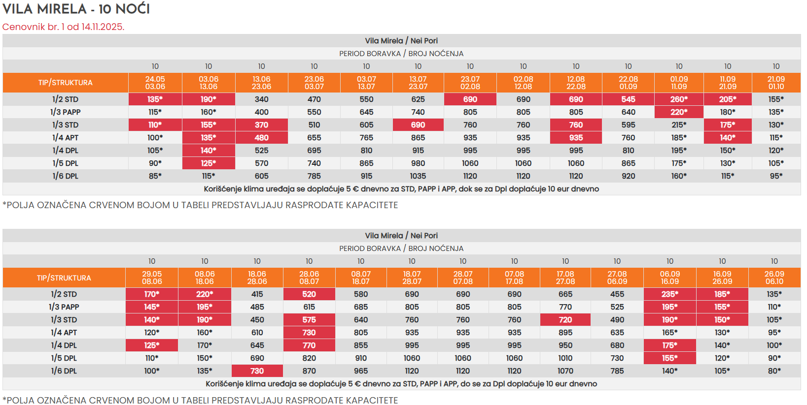 Sve cene u tabelama date su u eurima, a plative su isključivo u dinarskoj protivvrednosti po srednjem kursu Narodne banke Srbije na dan uplate. Cena aranžmana garantovana je samo za uplaćeni deo ukupne sume, ostatak je podložan promeni u slučaju oscilacije kursa ili inflacije.
