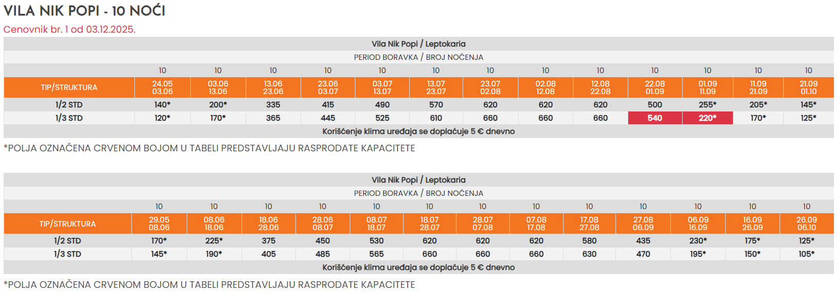 * - Sve cene koje su označene znakom “*” (zvezdica) podrazumevaju predsezonske i postsezonske cene, a koje obuhvataju prevoz autobusom sa polaskom iz Niša i smeštaj u odabranom objektu po osobi sa polaskom iz Niša. Ukoliko je polazak severnije od Niša, cena se uvećava za iznos teritorijalne doplate u tabeli autobuskog prevoza.