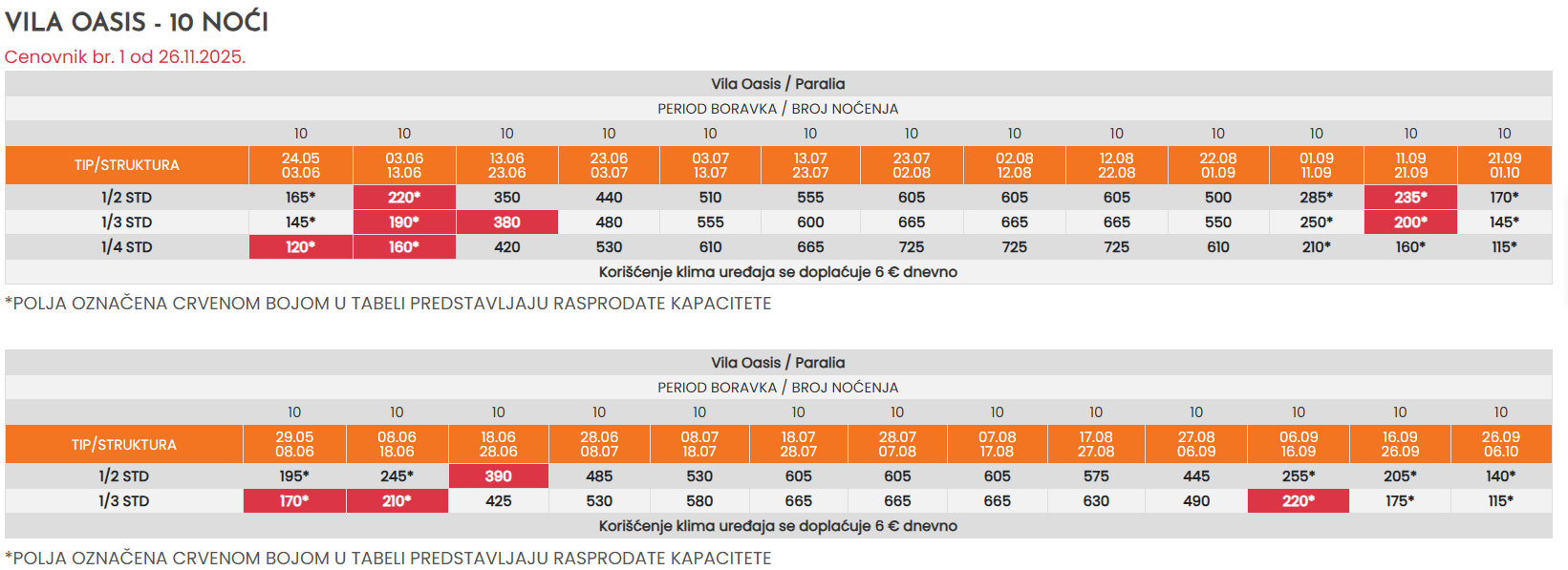 Sve cene u tabelama date su u eurima, a plative su isključivo u dinarskoj protivvrednosti po srednjem kursu Narodne banke Srbije na dan uplate. Cena aranžmana garantovana je samo za uplaćeni deo ukupne sume, ostatak je podložan promeni u slučaju oscilacije kursa ili inflacije.