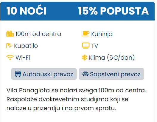 • Klimatska taksa u Grčkoj, koja se plaća se na licu mesta vlasniku vile ili predstavniku partnera. Plaća se umesto boravišne takse koja je bila aktuelna od 2018. do sada. Apartmani svih kategorija 2€ po sobi po noći