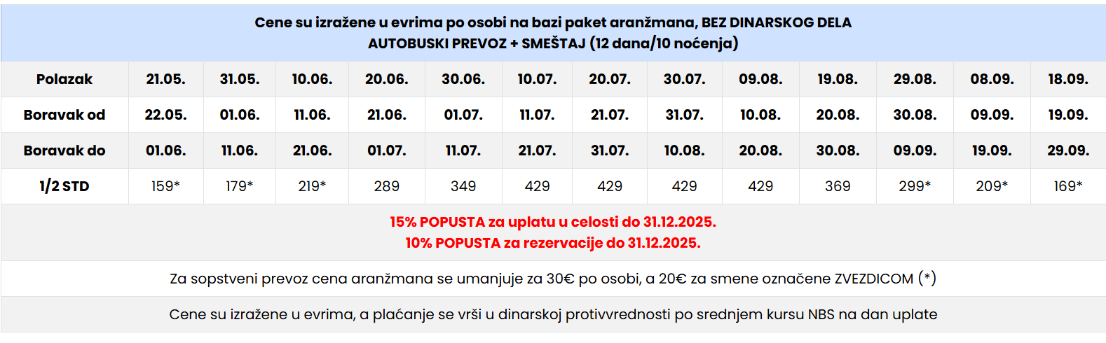 Cena aranžmana se umanjuje za 30€ po osobi, osim za predsezonu i postsezonu (smene označene*) gde se u slučaju korišćenja sopstvenog prevoza umanjuje za 20€.