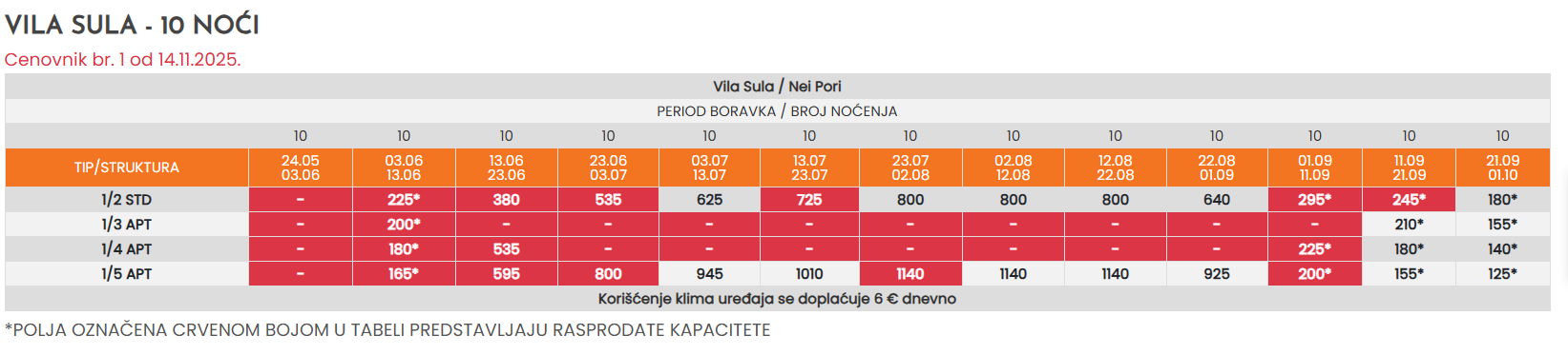 Sve cene u tabelama date su u eurima, a plative su isključivo u dinarskoj protivvrednosti po srednjem kursu Narodne banke Srbije na dan uplate. Cena aranžmana garantovana je samo za uplaćeni deo ukupne sume, ostatak je podložan promeni u slučaju oscilacije kursa ili inflacije.
